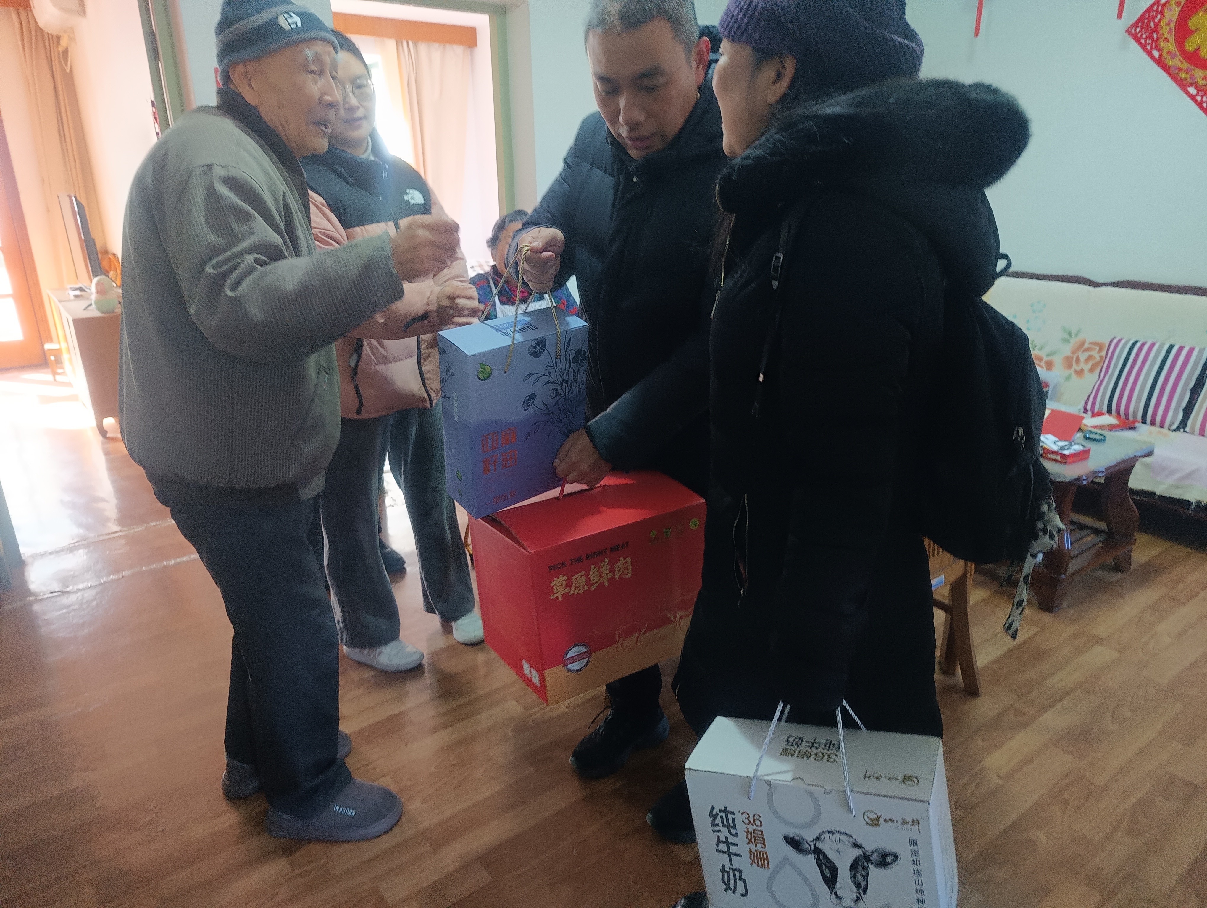 在慰問過程中,黨員們深入到每一戶困難黨員家中,詳細了解了他們的健康狀況、家庭生活情況以及目前所面臨的實際困難,并為老人們送上了青海特產牛羊肉、娟姍牛奶、五常大米、亞麻籽油等生活物資。
