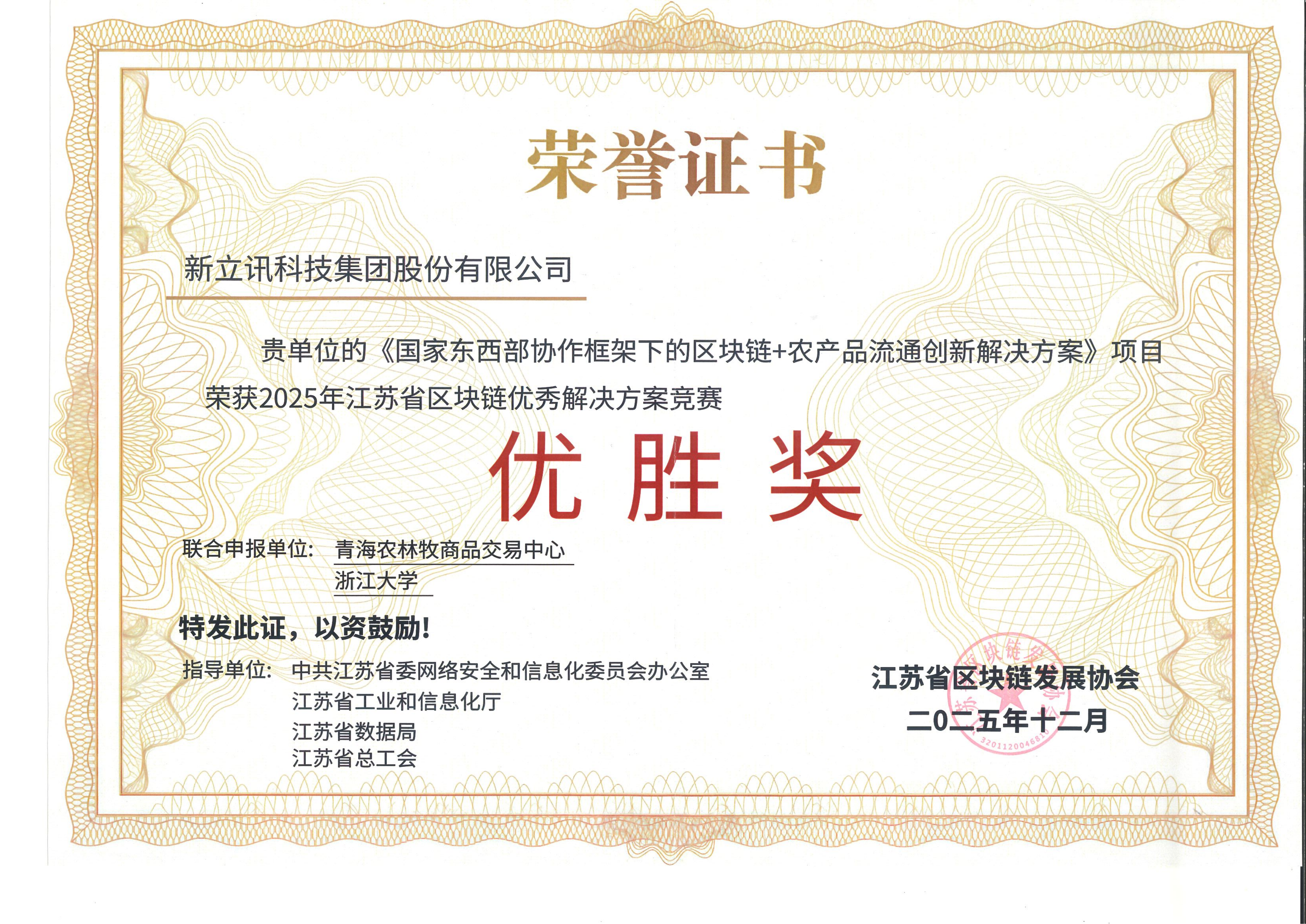新立訊科技集團(tuán)聯(lián)合青海農(nóng)林牧商品交易中心、浙江大學(xué)以“《國家東西部協(xié)作框架下的區(qū)塊鏈+農(nóng)產(chǎn)品流通創(chuàng)新解決方案》”項(xiàng)目榮獲2025年江蘇省區(qū)塊鏈優(yōu)秀解決方案競(jìng)賽“優(yōu)勝獎(jiǎng)”,通過?創(chuàng)新構(gòu)建“區(qū)塊鏈+農(nóng)產(chǎn)品流通”體系,通過“雙鏈四端”架構(gòu)實(shí)現(xiàn)全鏈條可信協(xié)同,有效破解東西部協(xié)作中農(nóng)產(chǎn)品質(zhì)量追溯難、信息不對(duì)稱、結(jié)算效率低等痛點(diǎn),強(qiáng)化“互聯(lián)網(wǎng)+農(nóng)業(yè)”建設(shè),加快推動(dòng)傳統(tǒng)農(nóng)產(chǎn)業(yè)數(shù)字化、智能化轉(zhuǎn)型升級(jí),構(gòu)建新型的線上線下相結(jié)合的新時(shí)代農(nóng)副產(chǎn)品線上銷售交易數(shù)據(jù)場(chǎng)景。