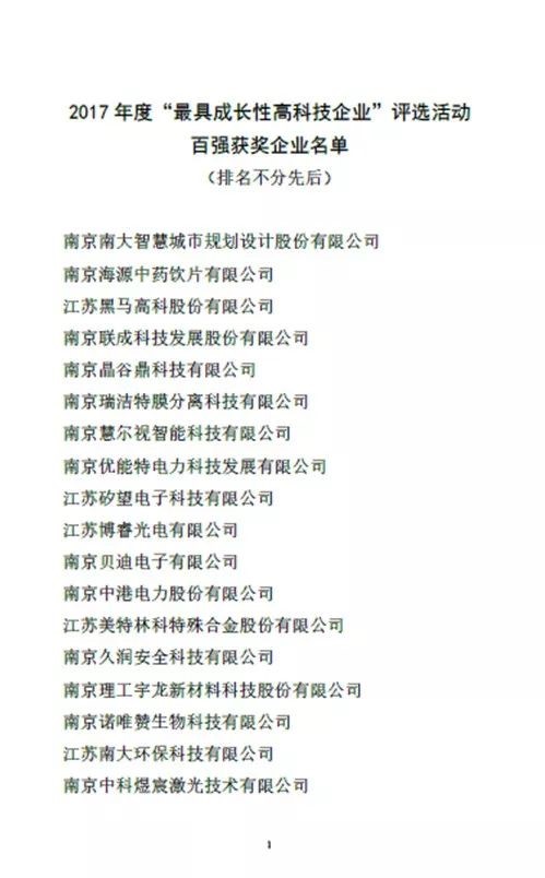 2017年度江蘇省“最具成長性高科技企業”評選活動是由江蘇省生產力促進中心、江蘇省生產力促進協會、江蘇銀行、南京銀行、中國農業銀行江蘇省分行、中國銀行江蘇省分行、中國建設銀行江蘇省分行共同舉辦,主旨是落實江蘇省省委“兩聚一高”戰略部署,促進科技資源和金融資源有效結合,進一步引導金融機構支持科技型企業,推動江蘇省戰略性新興產業發展。組委會通過對企業技術評審、答辯考察評審等程序,遴選出創新實力強、成長性高的科技型企業100家,給予相關科技、金融信貸等優惠政策,推動企業更快更好發展。