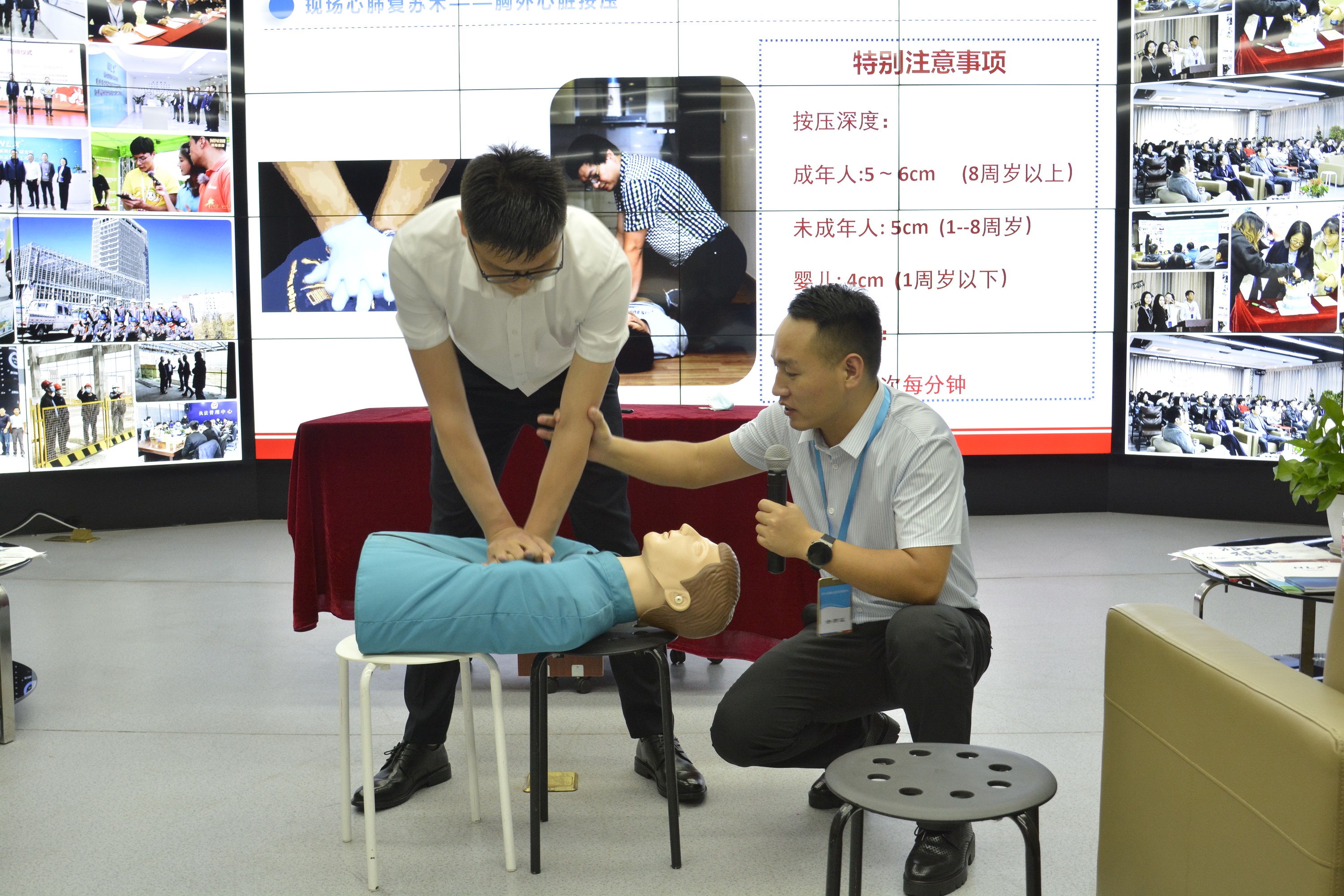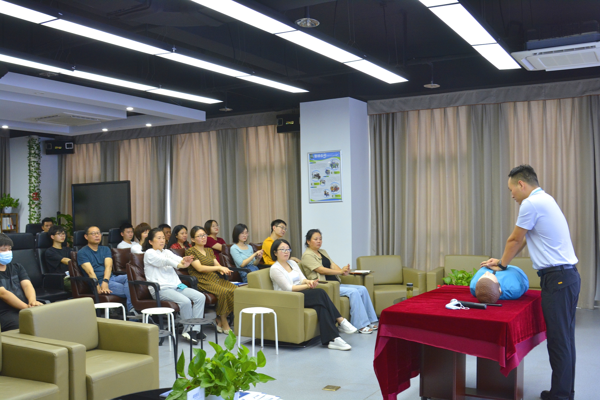 活動中,任樂義老師生動幽默地為大家講解了突發(fā)意外傷害的急救處理方法,并現(xiàn)場演示了心肺復蘇術、人工呼吸、海姆立克急救法等相關救護操作,同時給大家普及了重大疾病案例分析及預防措施、亞健康、慢性疾病的預防,包括肺癌、肝癌、胃癌、宮頸癌、慢性病等早期信號及預防方法。同事們認真聆聽,細心觀看,還現(xiàn)場進行了操作演練。