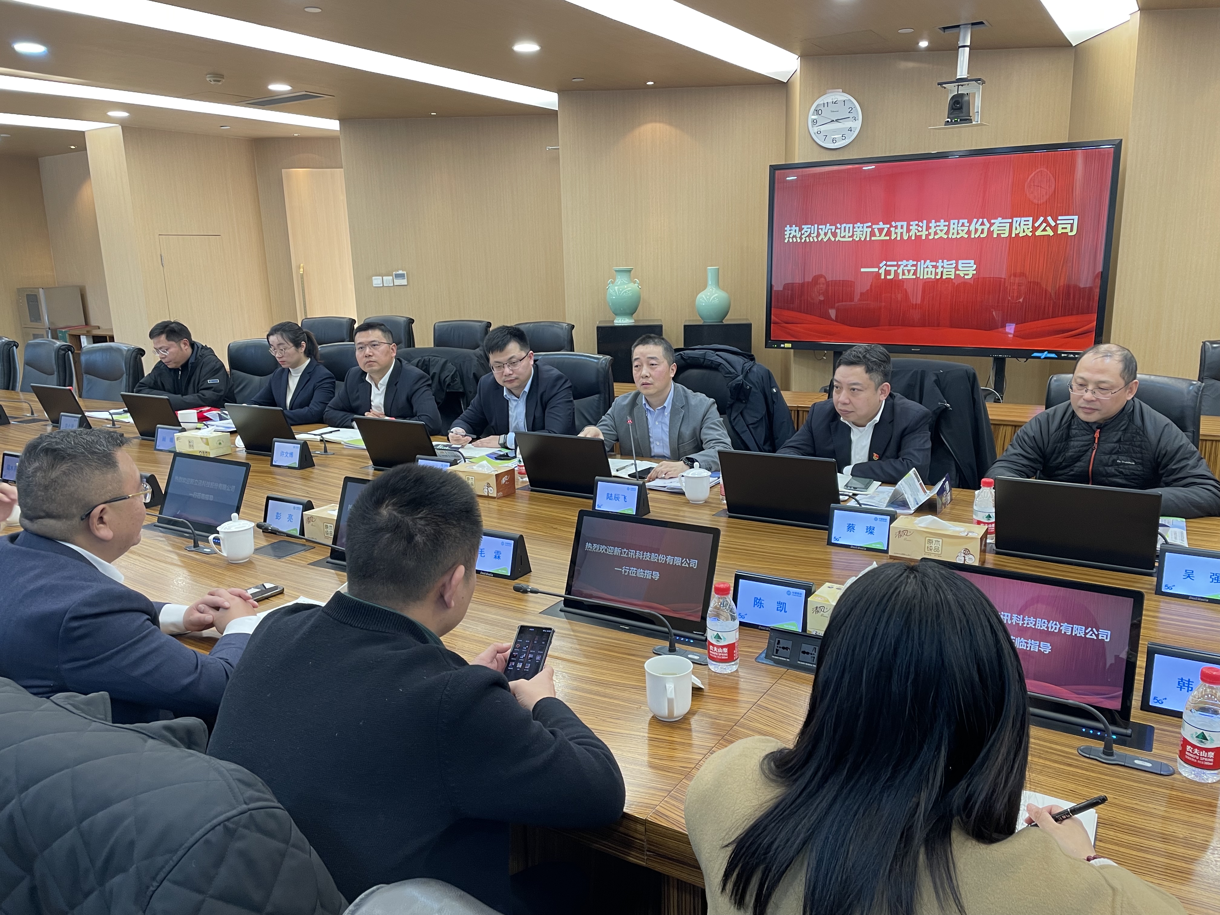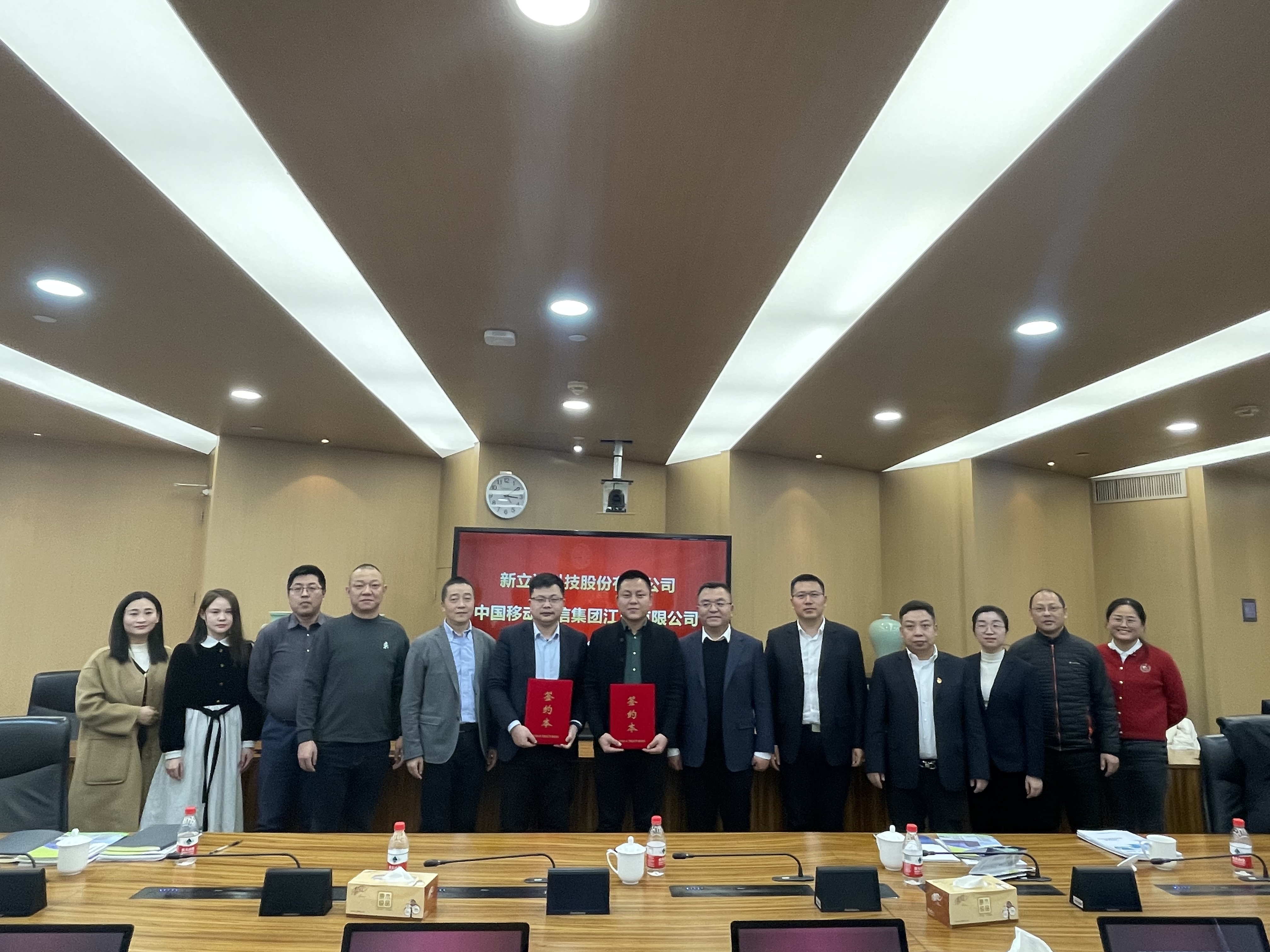 2024年1月25日,新立訊與中國移動通信集團江蘇有限公司在省移動大樓913會議室舉行戰略合作簽約儀式。中國移動通信集團江蘇有限公司省政企客戶中心副總經理陸辰飛,省集團客戶部行業應用中心總經理卜榮勝,南京移動集團客戶部總經理蔡璨,雨花臺移動總經理許文博等移動公司代表出席。新立訊董事長兼總經理毛霖攜財務總監彭亮,華東事業部總經理陳凱,西北事業部總經理楊楊等管理層出席簽約。